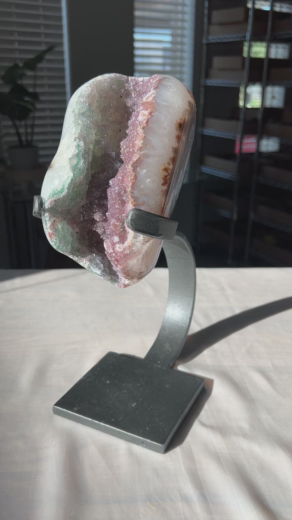 Amethyst Freeform on metal stand with breathtaking multicolored sparkles! Enchanting hues of green, purple, and pinks!